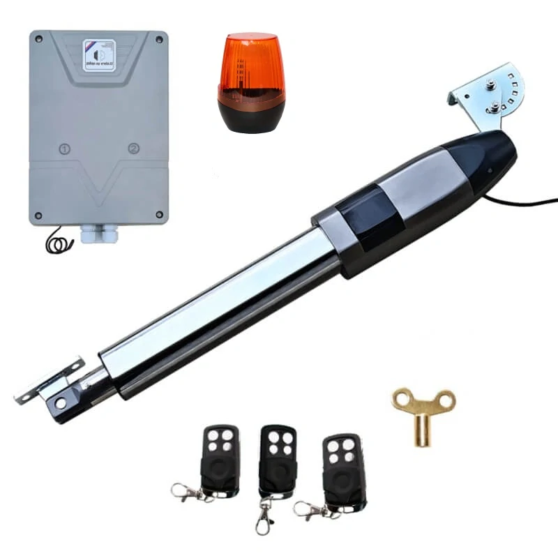 Obsah balení: Pohonné rameno 24V, řídící jednotka s transformátorem 230/24V a s programovatelnou řídící deskou s displejem pro zobrazení nastavení, tři dálkové čtyřkanálové ovladače (s kovovým rámečkem a zajížděcí krytkou spínačů) s dosahem 50m z automobilu s plovoucím kodem, výstražný maják s možností nastavení blikání, nebo svícení, kompletní kovové pozinkované instalační příslušenství pro montáž (profily síly 6mm), 1ks odjišťovací klíč pro případ výpadku elektřiny, podrobný a srozumitelný návod na montáž, zapojení a nastavení v češtině (i s návodem montáže ven z areálu).