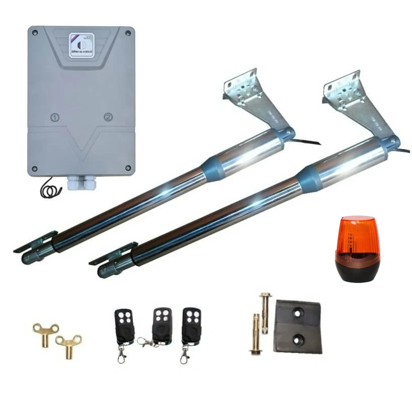 Obsah balení: 2ks pohonných motorů 24V, plně programovatelná řídící jednotka na 230V vybavena displejem pro zobrazení nastavení a transformátorem 230V/24V, tři dálkové čtyřkanálové ovladače (s kovovým rámečkem a zajížděcí krytkou spínačů) s dosahem 50m z automobilu s plovoucím kódem, výstražný maják s možností nastavení blikání, nebo svícení, kompletní kovové pozinkované instalační příslušenství pro montáž (profily síly 6mm), gumový doraz pro křídla brány, 2ks odepínací klíče pro případ výpadku el. energie, podrobný návod na montáž, zapojení a nastavení v češtině.